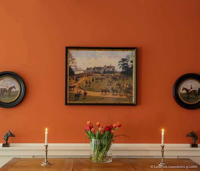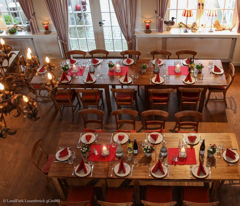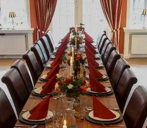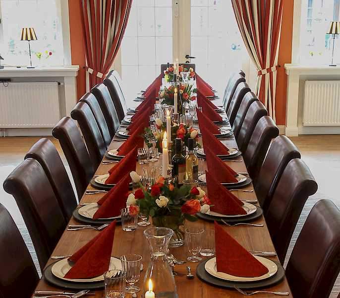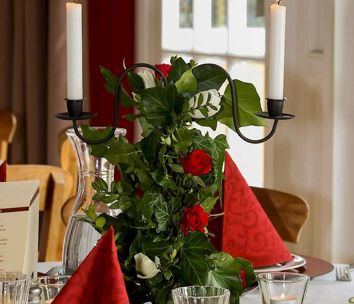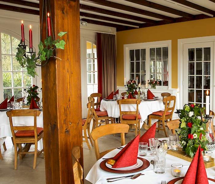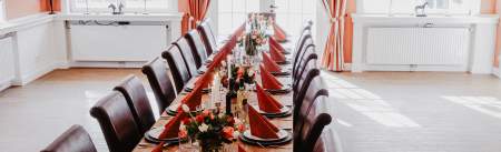 Die Orangerie ist sehr beliebt bei großen Gesellschaften und besonders Hochzeiten. Mit den großen Flügeltouren verleiht die Orangerie ein helles und warmes Ambiente. Je nach Aufstellung der Tische, können 80 bis 100 Personen für ein gesetztes Essen Platz nehmen. Außerdem verfügt die Orangerie über eine eigene Terrasse und einen Garten, sodass man auch die privaten Momente draußen genießen kann.